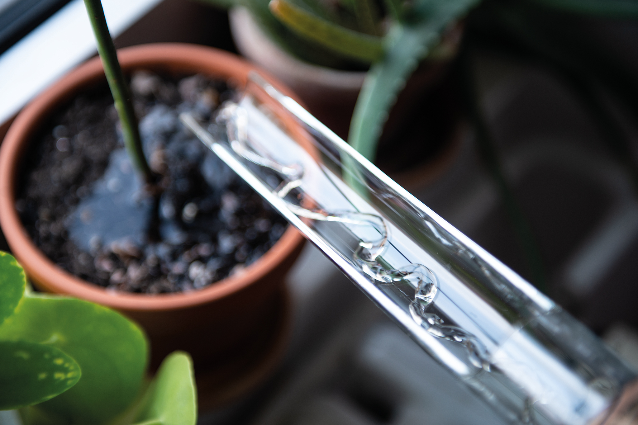 The water has to make its way through the spout of the cans. It doesn’t do that as directly as it does with a traditional watering can. It takes a detour, but an aesthetic one, because it creates serpentine lines and bubbles that you can look at while standing and pausing. Filling the cans must be done slowly, and the path from the faucet to the plant is also best done carefully. The materiality supports deliberate and concentrated handling.